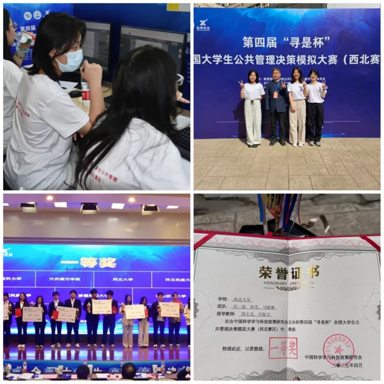 在 4 月 13 日结束的第四届“寻是杯”全国大学生公共管理决策模拟大赛(西北赛区)中,由我院2023级应急管理专业和管理科学专业学生刘一霏、徐莹、马娅琳组成的“y 的三次方”队一路过关斩将,荣获一等奖,我院周文光老师、许振宇老师荣获优秀指导教师奖。此次大赛旨在锻炼学生公共管理决策能力和团队协作能力,提升学生对公共管理问题的分析和解决能力。“y 的三次方”队在比赛中充分发挥专业优势,深入分析案例,精准制定决策方案,展现了我院学生的卓越风采。
