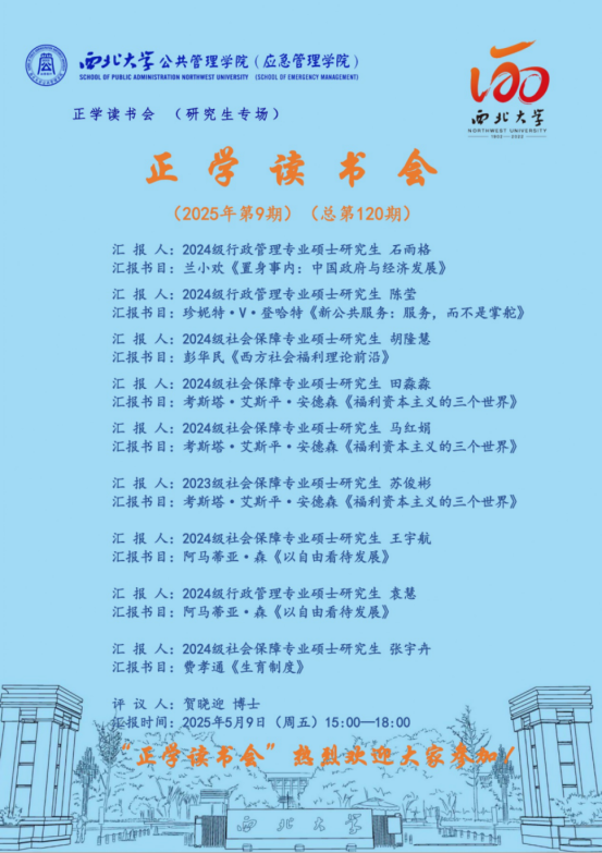2025年5月9日,我院在西学楼北1310举办了2025年第9期正学读书会。西北大学565net必赢2024级行政管理专业硕士研究生石雨格、2024级行政管理专业硕士研究生陈莹、2024级社会保障专业硕士研究生胡隆慧、2024级社会保障专业硕士研究生田淼淼、2024级社会保障专业硕士研究生马红娟、2023级社会保障专业硕士研究生苏俊彬、2024级社会保障专业硕士研究生王宇航、2024级行政管理专业硕士研究生袁慧、2024级社会保障专业硕士研究生张宇卉分别作为主讲人进行读书汇报,565net必赢2023级博士研究生贺晓迎担任评议人,部分研究生旁听了此次报告会。