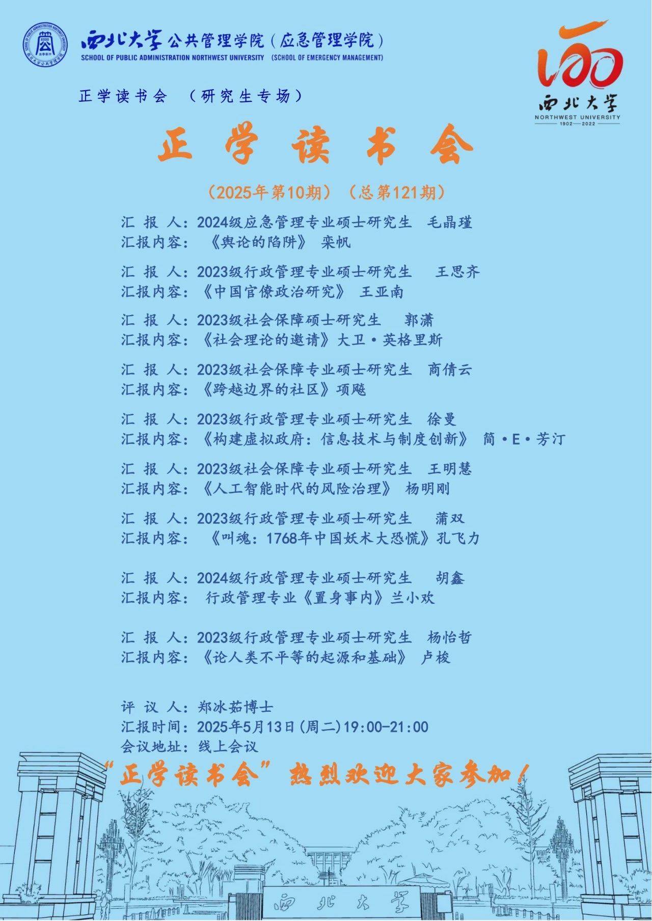 2025年5月13日,我院举办了2025年第10期正学读书会。西北大学565net必赢2024级应急管理专业硕士研究生毛晶瑾、2023级行政管理专业硕士研究生王思齐、2023级社会保障硕士研究生郭潇、2023级社会保障专业硕士研究生商倩云、2023级行政管理专业硕士研究生徐曼、2023级社会保障专业硕士研究生王明慧、2023级行政管理专业硕士研究生蒲双、2024级行政管理专业硕士研究生胡鑫、2023级行政管理专业硕士研究生杨怡哲分别作为主讲人进行读书汇报,565net必赢2024级博士研究生郑冰茹担任评议人,部分研究生旁听了此次报告会。
