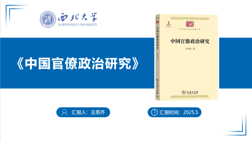 2023级行政管理专业硕士研究生王思齐在本次正学读书会从作者简介、写作背景、逻辑思路和观点内容四个部分分享王亚南所著的《中国官僚政治研究》一书。首先,汇报人将王亚南的68载的岁月主要分为青年立志、潜心学问和出任厦大三个部分,全面详细地介绍了其生平事迹。其次,汇报人在第二部分开篇分享了王亚南撰写此书的直接原因,即王亚南对李约瑟博士关于中国官僚政治相关问题的探讨。同时,也对当时中国的时代背景进行了大致介绍。再次,她介绍了全书的逻辑思路,将全书分为三部分:第一,对官僚政治的概念进行界定,同时也对英法、德俄及美国的官僚政治的背景和结局进行阐述;第二,主要聚焦于中国官僚政治的组织结构、权力分配和运作机制,阐述其内部逻辑和运行规律;第三,讨论中国官僚政治对中国社会长期停滞的影响,对当代社会造成的现实问题以及中国现代官僚政治的三个演化阶段并提出可能的未来发展方向。最后,思齐同学着重讲解了官僚政治的概念及起源、中国官僚政治产生原因及社会经济基础、支持官僚政治高度发展的两大杠杆——两税制和科举制,同时分析了官僚政治对中国的最大影响——社会长期停滞,并阐述作者对中国现代官僚政治转型方向的观点:相信科学,相信人民,人民掌握主导权,主动参与政治,最终必然会终结官僚政治,走向现代政治。