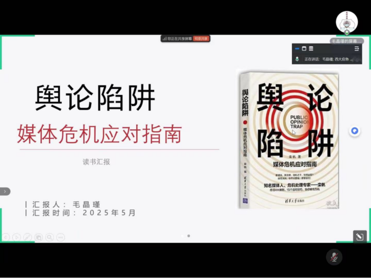 2024级应急管理硕士研究生毛晶瑾分享了栾帆所著的《舆论陷阱:媒体危机应对指南》。她从作者介绍、章节概要和思考总结三个维度进行了解读。毛晶瑾同学先阐述了新媒体时代舆情的演变,厘清了传统媒体与新媒体的界限,并指出两者在信息传播中扮演的不同角色及影响力。继而,列举并剖析了诸如虚假信息陷阱、情绪化陷阱、片面报道陷阱等常见的舆论陷阱类型,并深入探讨了引发媒体危机的诸多因素。在危机应对方面,书中着重强调了三大基本原则:及时性原则,即迅速反应,抢占舆论高地,第一时间发出权威声音;真实性原则,确保所发布信息准确无误、真实可靠,杜绝隐瞒欺骗,以维护公众信任;一致性原则,保证信息传达连贯统一,避免出现矛盾混乱,损害自身公信力。针对不同类型与阶段的危机,书中提出了一系列应对策略,包括积极沟通策略,即主动与媒体、公众交流互动,传递正面信息,塑造良好形象,减少负面舆情影响。在思考总结环节,毛晶瑾同学回顾了书中核心观点,提出通过有效沟通、形象修复等策略能够全方位提升危机应对处置能力,为企业、社会组织乃至个人应对舆论风波、开展危机管理提供了操作性的指引。
