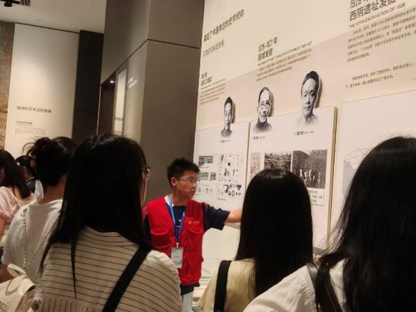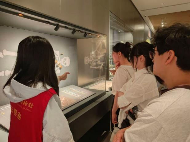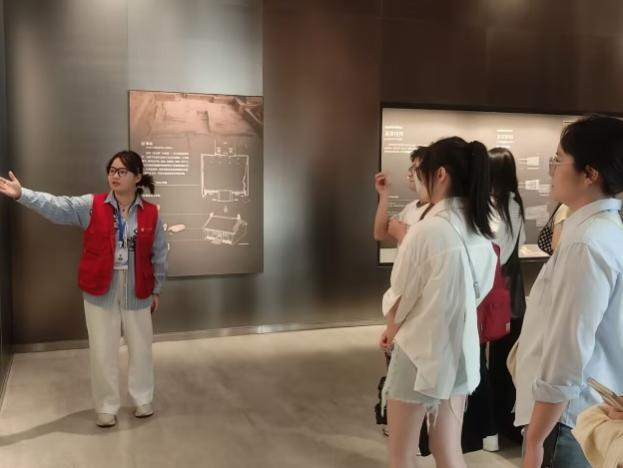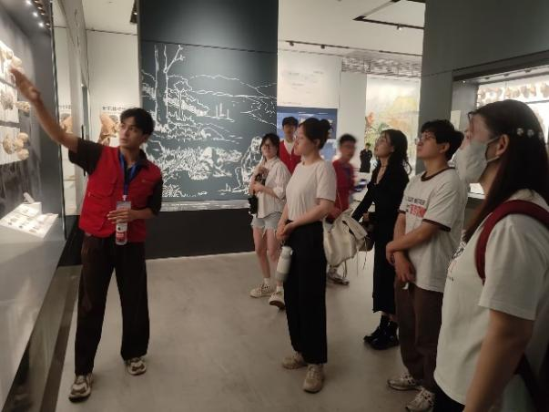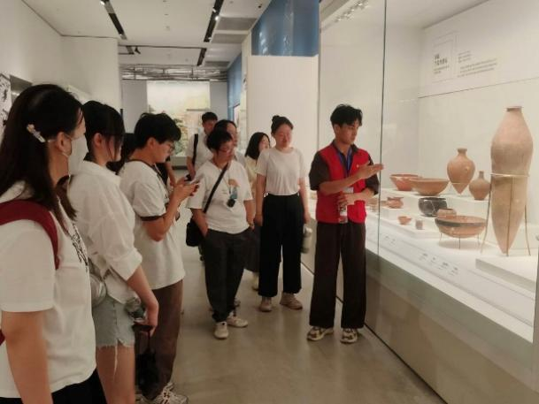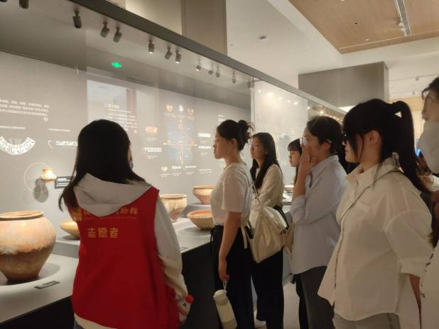 博物馆志愿者首先带领同学们参观“考古历程”展馆,仔细为同学们讲解考古文化从萌芽到成熟的发展历程以及优秀考古团队的风采。同学们在志愿者精彩动人的讲解中,与展柜内的历史文物隔空对话,感受每一个文物的前世今生。