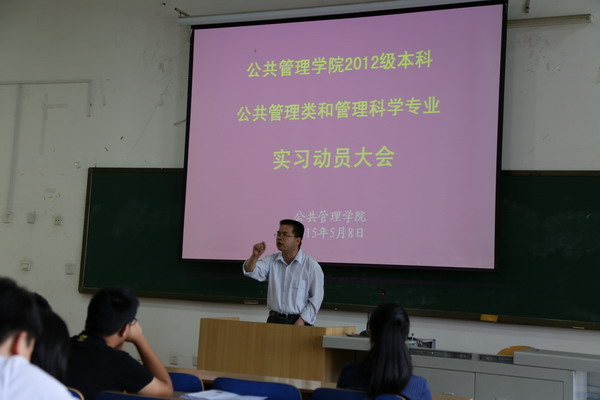 5月8日上午9:00学院召开了2012级公共管理类和管理科学专业实习动员大会。孙录见书记、杨九龙副院长、何君安老师、朱楠老师、邓武红老师、孟蕾老师、许振宇老师、韩杰老师及全体实习学生参加了会议。