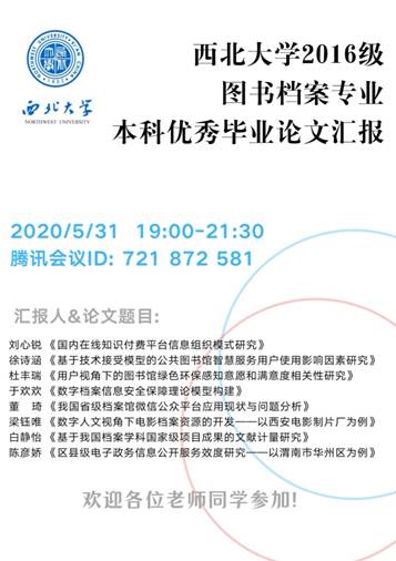 531日,我院公共信息资源管理系成功举办了图档专业2016级本科生优秀毕业论文在线交流会,60余位师生参加。来自图书馆学的刘心锐、徐诗涵和杜丰瑞,以及来自档案学的于欢欢、梁钰唯、白静怡、陈彦娇和董琦等8位同学做了毕业论文的在线分享。黄新荣教授主持了本次交流会。在会议开始前,黄新荣教授对今年16级图档专业毕业论文的总体完成情况做出了介绍。2020年由于疫情影响,论文答辩通过线上开展,于520日分成了五组,举行了毕业论文答辩,所有同学都顺利通过了答辩,参与答辩的老师评选出8篇优秀论文。老师们普遍认为今年学生的论文水平比较高,十分值得肯定和鼓励。8篇论文的作者,大部分都被各高校录取读研,让他们与广大师生进行在线交流,既是对同学们的表扬,也是给他们一次学术能力展示的机会。