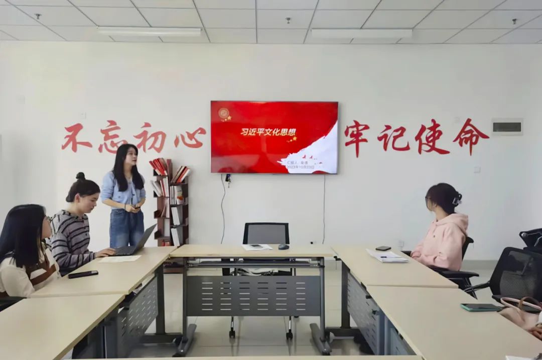 活动伊始,毛娅同志为大家介绍了本次活动开展的背景:“在全国宣传思想文化工作会议上,党中央正式提出并系统阐述了习近平文化思想。这是一个重大决策,在党的理论创新进程中具有重大意义,在党的宣传思想文化事业发展史上具有里程碑意义。”习近平文化思想内涵丰富,视野宏大,贯通古今,论述深刻,既有文化理论观点上的创新和突破,又有文化工作布局上的部署要求,明体达用、体用贯通,明确了新时代文化建设的路线图和任务书,标志着我们党对中国特色社会主义文化建设规律的认识达到了新高度,表明我们党的历史自信、文化自信达到了新高度,并在我国社会主义文化建设中展现出了强大伟力。深入学习领会习近平文化思想,是全党尤其是全国宣传思想文化战线的一项重要政治任务。简要介绍过后,毛娅同志组织与会成员共同观看《新思想引领新征程:铸就中华文化新辉煌》视频片段。