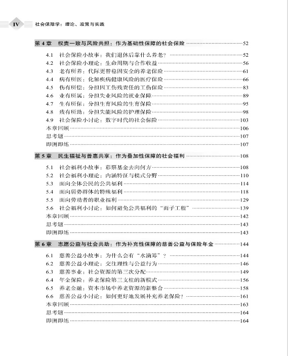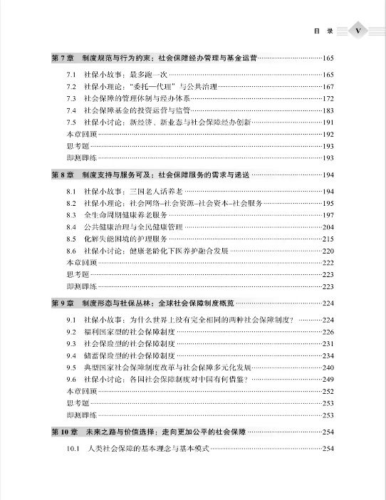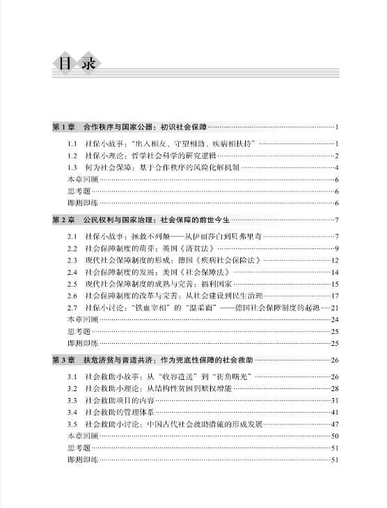 本教材以“社保小故事—社保小理论—社保小内容—社保小讨论”为框架主线,共十章内容,从社会保障的原生画像与历史全貌、制度框架与体系内容、管理运营与服务递送、制度改革与发展趋势等方面讲述了社会保障的前世今生和精彩故事,分享了社会保障的思想光芒和体系内容,探讨了社会保障的政策议题和热点话题。第一章“合作秩序与国家公器:初识社会保障”以及第二章“公民权利与国家治理:社会保障的前世今生”主要概述了社会保障学的基础知识,内容包括社会保障的概念、社会保障的结构、社会保障制度的产生及发展历程;第三章“扶危济困与普适共济:作为兜底性保障的社会救助”、第四章“权责一致与风险共担:作为基础性保障的社会保险”、第五章“民生福祉与普惠共享:作为叠加性保障的社会福利”以及第六章“志愿公益与社会共助:作为补充性保障的慈善公益与保险年金”深入介绍了社会保障制度与社会保障体系,内容包括社会保险、社会救助、社会福利、社会优抚与慈善事业、福利年金与健康管理;第七章“制度规范与行为约束:社会保障经办管理与基金运营”以及第八章“制度支持与服务可及:社会保障服务的需求与递送”主要介绍了与社会保障相关的管理内容与工作,内容包括社会保障管理监督、社会保障基金管理、社会保障服务、社会保障法律制度;第九章“制度形态与社保丛林:全球社会保障制度概览”以及第十章“未来之路与价值选择:走向更加公平的社会保障”探讨了社会保障制度改革与社会保障发展趋势。