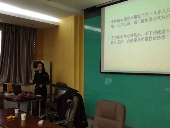 郑安云教授首先生动地给大家介绍心理危机的经典案例,深入浅出地讲解“心理危机”的重要内涵,她指出心理危机是指由于突然遭受严重灾难、重大生活事件或精神压力,使生活状况发生明显的变化,尤其是出现了用现有的生活条件和经验难以克服的困难,以致使当事人陷于痛苦、不安状态,常伴有绝望、麻木不仁、焦虑,以及植物神经症状和行为障碍。郑安云教授就“福建南平重大凶杀案”、“马加爵事件”、“重庆市万州区公交坠江事件”等典型案例剖析了事件背后的心理危机发生逻辑。随后她指出,个体的心理危机爆发之时一旦介入公共环境、公共生活,就可能引发公共危机,不关注个体心理危机,不干预或者不给予社会支持,必然带来扩散性的伤害。郑安云教授讲到,当一个人出现心理危机时,当事人可能及时察觉,也有可能“不知不觉”,一个自以为遵守某种习惯了的行为模式的人,也有可能潜在着心理危机,染有严重不良瘾癖的人,常常潜伏着心理危机,当去戒除瘾癖时,心理危机便会暴露无遗。通过分析心理健康与心理病态个概念联系与区别,郑教授认为,心理健康与心理病态的是一个连续线,表现为“精神病—人格障碍—神经症—正常—超常”的连续光谱。