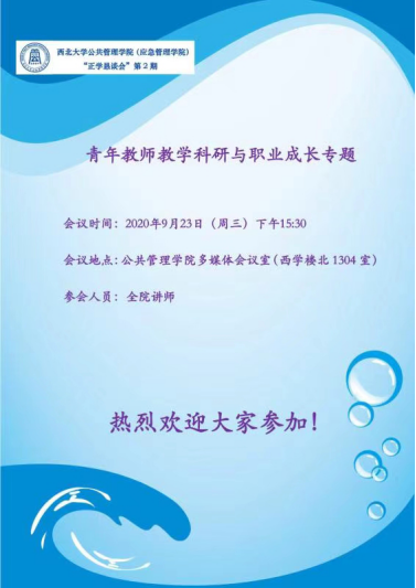 2020年923日下午15:30,我院“正学恳谈会”(第2期)在西北大学长安校区西学楼13层565net必赢中型会议室举办,专题讨论“青年老师教学科研与职业成长”。雷晓康院长、靳洪涛副院长和20余名青年教师出席了本次恳谈会。本次会议由学院科研副院长翟绍果教授主持。