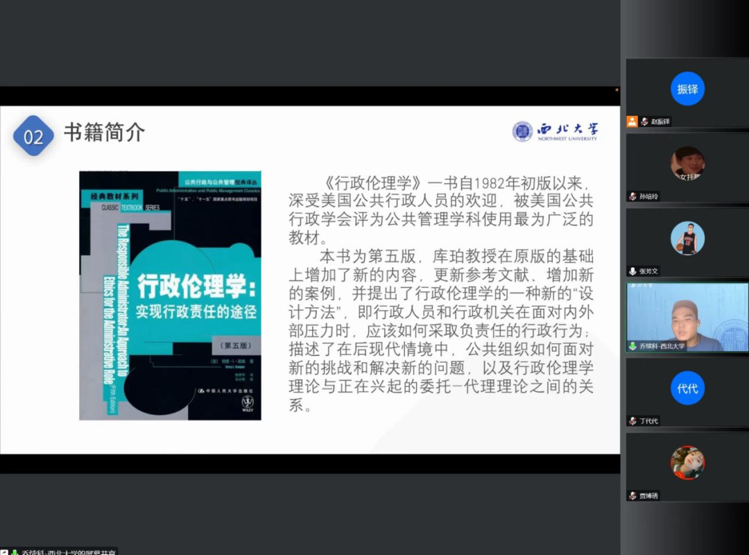 2021级行政管理专业硕士研究生乔续科汇报的书籍为《行政伦理学:实现行政责任的途径》,在对本书写作的背景进行阐释的基础之上,乔续科将本书内容分别从行政人员伦理学、行政组织伦理学以及方案设计三个层面对认识伦理决策、行政责任、责任冲突、负责任行政行为、伦理自主性和负责任的行政模式等方面核心内容进行逐项解读。最后也提出本书对于个人专业研究的意义和对服务型政府改革的实践价值。