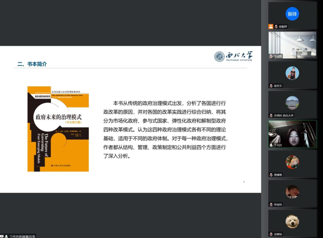 2021级行政管理专业硕士研究生丁代代分享的书目是B •盖伊•彼得斯的《政府未来的治理模式》。汇报主要从作者简介、书本简介、主要内容分析及总结四个方面展开。介绍了本书中彼得斯所提出的四种政府治理模式,并对市场式政府、参与式国家、弹性化政府与解制型政府在理念、结构、管理、政策制定及公共利益方面做了清晰的对比。最后,总结性地指出这四种政府治理模式不完全兼容、也不完全矛盾,可单独进行、也可结合进行。