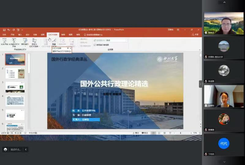 2021级行政管理硕士研究生豆琳怡分享的书目是《国外公共行政理论精选》,作者为彭和平等。她从作者简介、著作背景与目的、逻辑思路与框架、主要内容与观点、读后感想与启发这五个方面进行了这次的读书分享。她选取了八篇经典的公共行政理论进行了分享,分别为《行政学研究》《政治与行政》《公共行政与公共利益》《官僚制结构与人格》《公共行政科学:三个问题》《“竭力对付”的科学》《行政分权与政治权利》《论公共行政学》。豆琳怡在最后分享了她的阅读感受与总结,她认为经典的意义在于它的持久价值和影响力。任何一门科学体系在自己的形成和发展过程中,也包括行政科学,都有一些可以称之为经典的著作,这些著作为本学科体系的建构提供了某些具有基础性和普遍性的原则和规律。学习这些经典的理论著作有助于把我国行政学的理论研究和行政改革具体实践的结合引向深入。