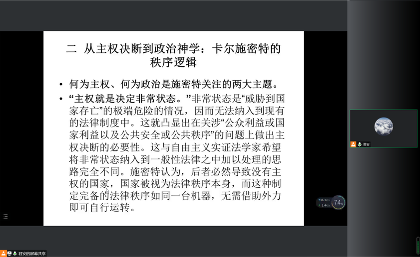 报告开始,何老师介绍了公共管理与政治的密切关系,详细阐述了政治学在各学科中的独特地位、公共管理与政治学的关系以及政治学研究对公共管理的具体作用,让同学们深刻认识到政治学学科对公共管理学科的重要作用。 接着,何老师结合现实,从三方面为同学们讲解了全球化时代政治秩序的构建路径。在第一部分何老师阐述了多元化时代中自由主义的困境,认为自由主义催生了其他政治秩序建构理论的产生。第二部分中则为同学们讲解了从主权决断到政治神学:卡尔施密特的秩序逻辑,提出施密特关注的两大主题——何为主权、何为政治,详细阐述了施密特的压制多元主义、强化政治一元论的秩序方案。在第三部分何老师讲述了从理性多元到重叠共识:罗尔斯的秩序想象,罗尔斯认为应当寻求重叠共识,以支持自由平等所组成的立宪政体及其政治观念。 最后,何老师对讲解的内容进行了总结,再次强调了政治学对公共管理学科的重要作用。