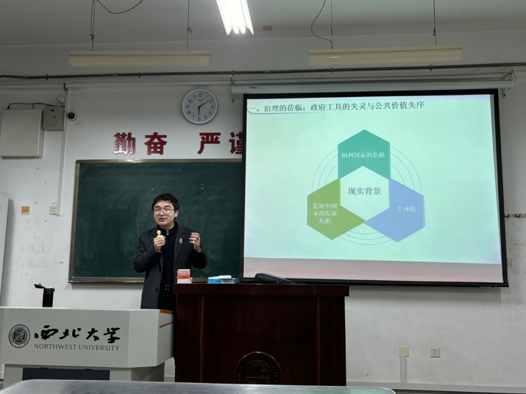 2023年12月13日晚,西北大学565net必赢马子博讲师在长安校区教学一号楼1209教室为我院2023级全体硕士研究生作了题为“治理理论的西方谱系与中国叙事”的专题讲座。