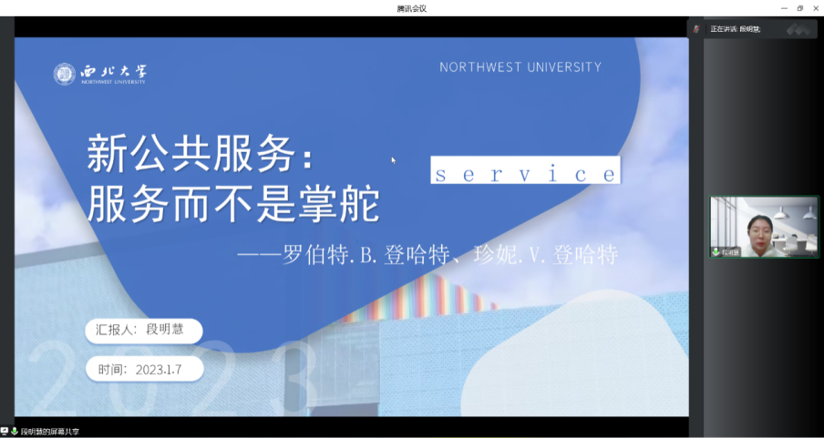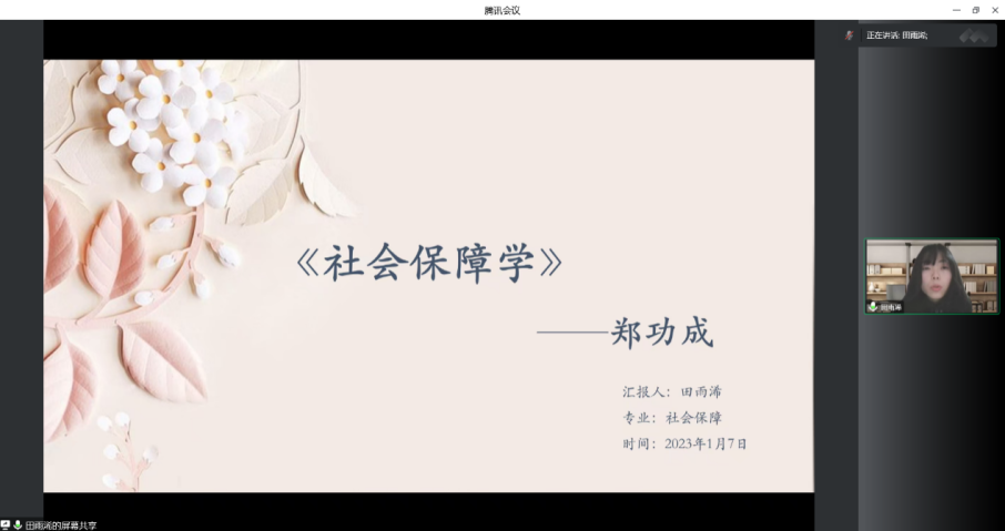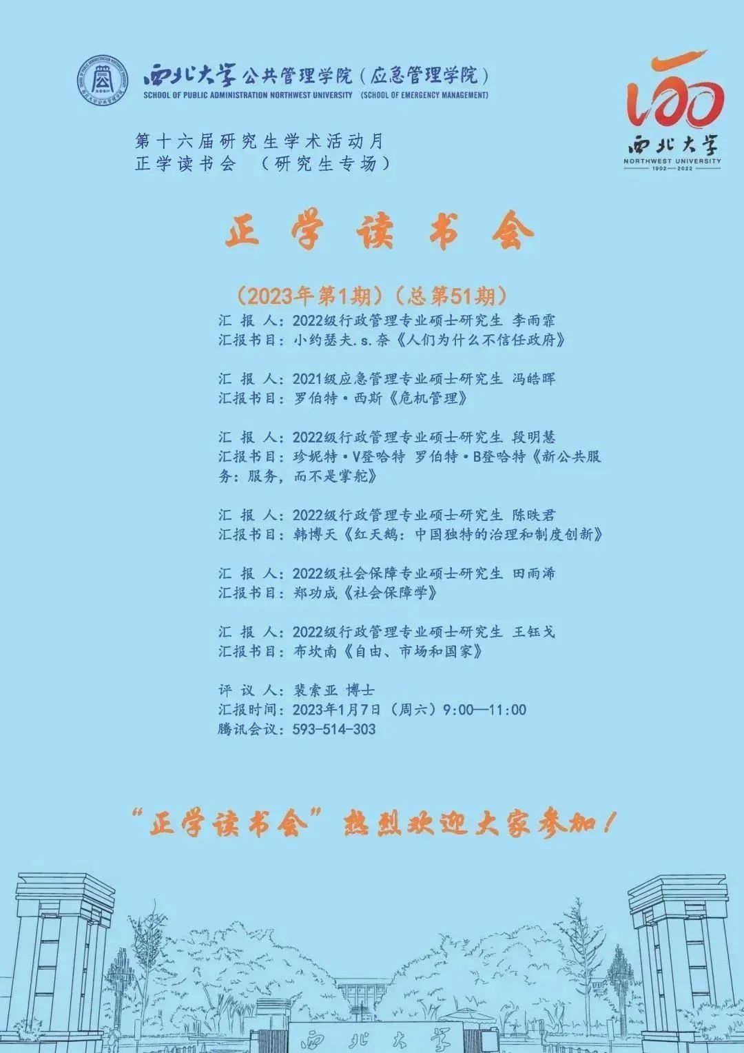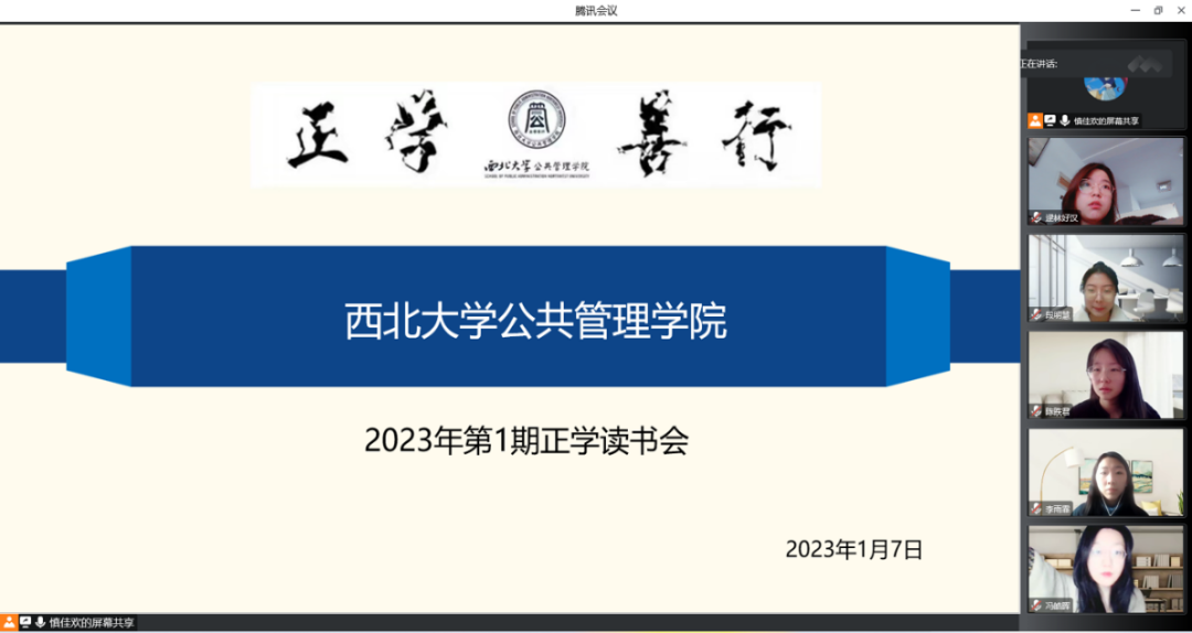 2023年1月7日上午,我院线上举办了2023年第1期正学读书会。2022级行政管理专业硕士研究生李雨霏、2021级应急管理专业硕士研究生冯皓晖、2022级行政管理专业硕士研究生段明慧、2022级行政管理专业硕士研究生陈昳君、2022级社会保障专业硕士研究生田雨浠、2022级行政管理专业硕士研究生王钰戈分别作为主讲人进行读书汇报,565net必赢2022级博士研究生裴索亚担任评议人,部分研究生旁听了此次报告会。