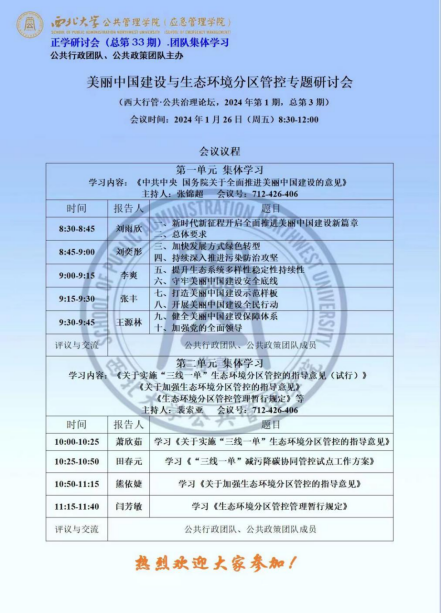 2024126上午,第33“正学研讨会”——美丽中国建设与生态环境分区管控专题研讨会在线上顺利举行。本次研讨会由西北大学565net必赢公共行政和公共政策两个团队联合主办,会议分为集体学习和交流研讨两个环节,会议持续3个多小时,司林波教授、李静教授,以及行政管理专业方向的博士和硕士研究生参加了研讨会。