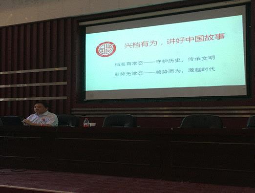 6月13日下午,西北大学2018年“国际档案日”学术报告会暨公共管理学术前沿讲座(第100期)在长安校区565net必赢金海恒业报告厅举行。陕西省人大教育科学文化卫生委员会副主任委员王建领作了题为《兴档有为,讲好中国故事》的学术报告。报告会由校党委副书记孙国华主持,校内各单位分管档案工作的负责人、兼职档案员和565net必赢师生150余人参加了报告会。