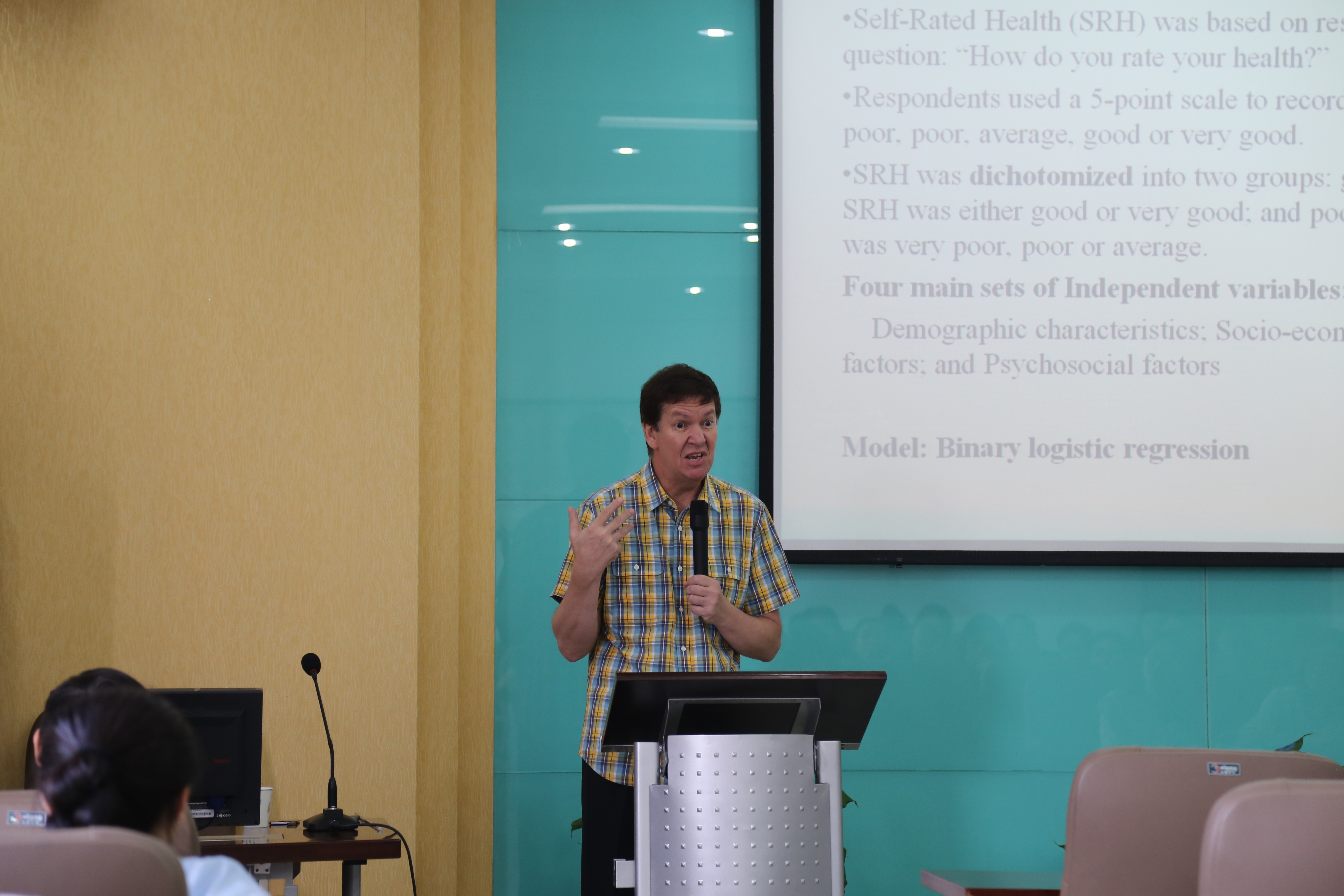 此次讲座主要分为三个主题,分别是居民社会经济地位与自评健康指数的关系、经济不平等与幸福感的关系以及收入不平等与幸福感的关系。Peter教授针对每一主题的研究背景、研究目标、研究内容、研究设计和结果进行了系统的描述和讲解,特别地对统计方法、数据分析模型及分析结果进行了详实地论证。针对第一个主题,教授将人口特征、社会经济地位、生活方式、心理状态四个因素作为自变量,将自评健康指数转变为二分变量的因变量,采用二元逻辑回归的统计方法进行结果分析,建立两个模型,得出了社会经济地位与自评健康指数的强相关性,生活方式与心理状态的弱相关性,并得出年轻男性的自评指数最高而年长女性的自评指数最低的结论。对于第二个主题,教授指出采用可将基尼系数与居民生活幸福感进行逻辑回归分析,采用了多分响应逻辑回归的统计方法,其中自评指数为因变量,绝对收入、基尼系数为自变量,最终得出自评健康状况与收入差距之间存在直接关系,且城镇的情况较之于农村更加恶化,即城镇居民的自评健康状况与收入差距的关系强于农村居民。对于第三个主题,采用定序多分响应逻辑回归,将定序变量幸福感作为因变量,并将收入不平等的测量要素基尼系数等作为自变量进行分析,得出两者之间为强关系的结论。以上三个主题得出的一致结论为社会经济状况及社会不平等对居民幸福感、健康状况至关重要,因而政府应当出台相关政策强力缩小贫富差距以提高居民生活幸福感和健康状况。
