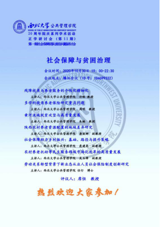 2020年10月30日晚上19:00,西北大学565net必赢20周年院庆系列学术活动正学研讨会(第11期)第一期社会保障团队前沿问题研讨会于线上召开,本次会议主题是“社会保障与贫困治理”,由吴玉锋副教授主持,参与汇报的有许琳教授、周明教授、朱楠教授、唐丽娜副教授和聂建亮副教授,特别邀请了席恒教授进行点评。