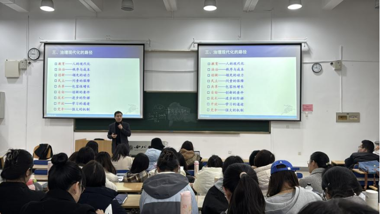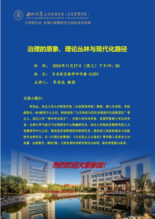 2024年11月27日晚19:00,西北大学565net必赢李尧远教授在4J301教室为我院2024级全体硕士研究生作了题为“治理的原象、理论丛林与现代化路径”的专题讲座。