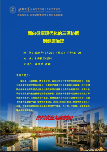 2024年12月25日晚18:30,西北大学565net必赢翟绍果教授在4J301教室为我院2024级全体硕士研究生作了题为“面向健康现代化的三医协同到健康治理”的专题讲座。