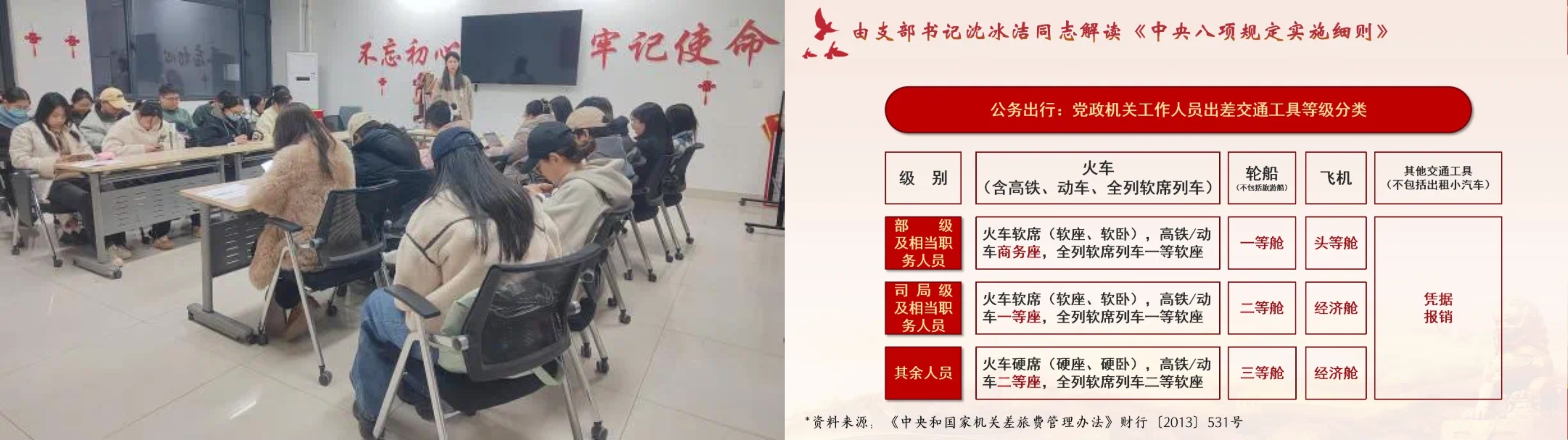 会议第二项,由支部书记沈冰洁同志解读《中共中央政治局贯彻落实中央八项规定实施细则》。沈冰洁同志逐项梳理了公务出行、公务接待、公务活动、办公用房等关键问题的规范标准。中央八项规定强调的是“正人先正己”,深入贯彻中央八项规定精神需要“狠抓节点”,因此,全体党员要自觉遵守廉洁自律各项规定,坚决抵制形式主义、官僚主义、享乐主义和奢靡之风,推动党的作风持续向好,为推进中国式现代化贡献智慧和力量。