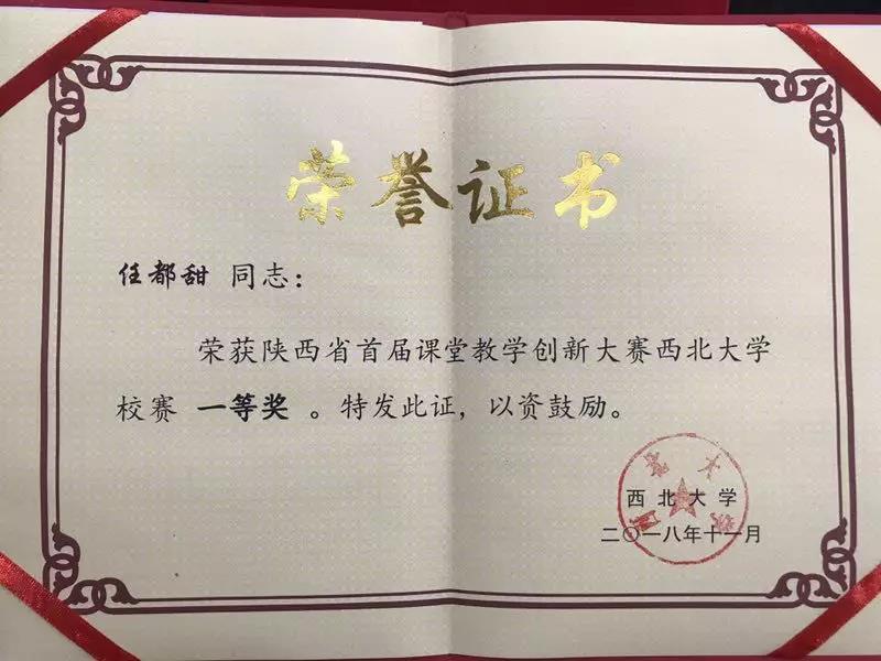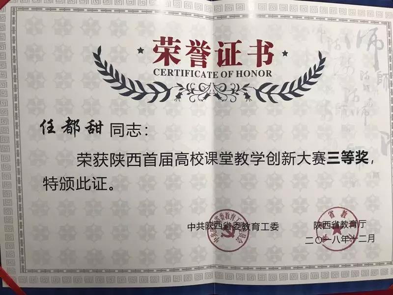 2018年,任都甜老师获得陕西省首届高校课堂教学创新大赛三等奖,校赛一等奖。
