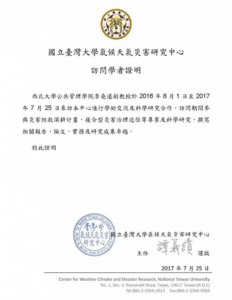 李尧远老师赴台湾访学的证明