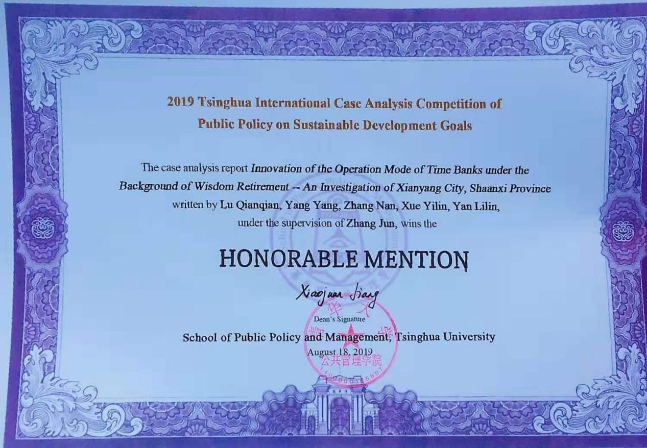 2019年8月份,清华大学2019年全球SDGs公共政策案例分析大赛经过初赛、复赛的筛选共12支队伍入围,,经过现场答辩,最终产生了两个一等奖,一个二等奖,三个三等奖及六个优秀奖。其中,由雷晓康教授、张珺指导的信息科学与技术学院2018级本科生杨洋团队的作品the Operation Mode of Time Banks under the Background of Wisdom Retirement(《智慧养老背景下的时间银行》)获得优秀奖。