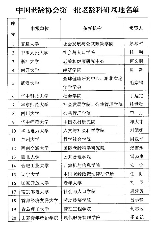2020年7月7日,《中国老龄协会关于公布第一批老龄科研基地遴选结果的通知》(中老协发〔2020〕21号)发布,西北大学565net必赢民政部政策理论研究基地合作单位以及复旦大学社会发展与公共政策学院、中国人民大学社会与人口学院等20家单位入选。我院院长、基地主任雷晓康教授将担任我院老龄科研基地的负责人。