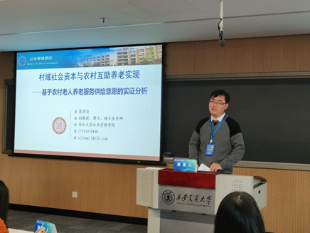 基地硕士研究生董子越、樊荣、陈博晗、邱杰、虎经博、孙娟参加了“身心健康与老年研究”分论坛,分别做了题为“居家社区机构相协调、医养康养相结合的农村养老服务体系建设路径研究”“社会网络与农村老人养老风险感知——基于对11省1126名农村老人的问卷调查”“村域社会资本对农村老人主观幸福感的影响——基于对全国32个村1137位农村老人的抽样调查”“时间和健康约束还是家庭保障挤出?——基于“个体—家庭”视角的农村老人互助养老参与制约因素研究”“新农保对农村老年人健康绩效的影响机理研究”“阶层认同、社会互动与第三支柱养老保险需求”的发言。基地硕士研究生王凤玺参加了“脱贫攻坚与乡村振兴”分论坛,并做了“从医养结合到医养康养相结合:逻辑与推进路径”的发言。基地硕士研究生王若莹、白璐、张悦、苏翊铭、信路芳、马骁等也参加了分论坛发言。