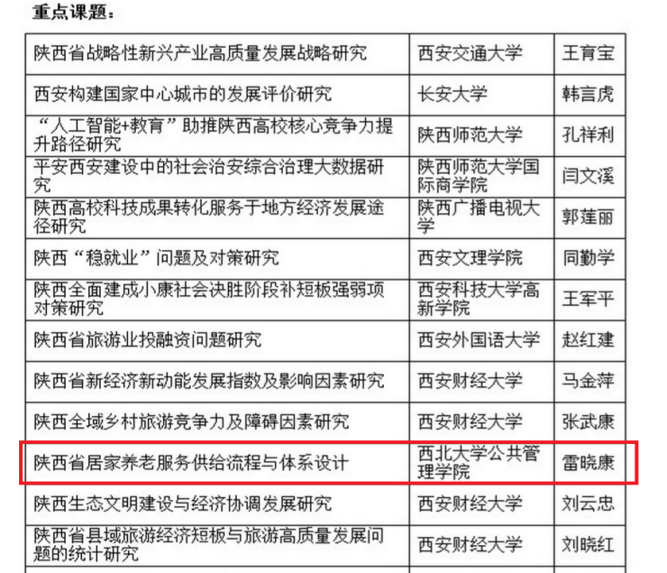 2019年度陕西省统计科学研究课题立项结果近期公布,共有54个项目批准立项,其中重大项目3项、重点项目24项、一般项目27项。雷晓康教授团申报的“陕西省居家养老服务供给流程与体系设计”课题获得重点课题立项资助。