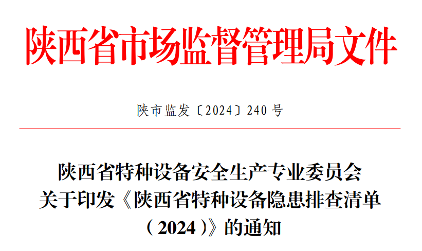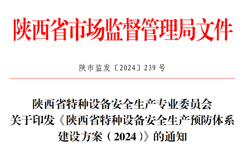近日,围绕贯彻落实党中央、国务院和省委、省政府防范化解安全生产重大风险这一总要求,省特种设备专委会制定印发《陕西省特种设备安全生产预防体系建设方案(2024)》和《陕西省特种设备隐患排查清单(2024)》。