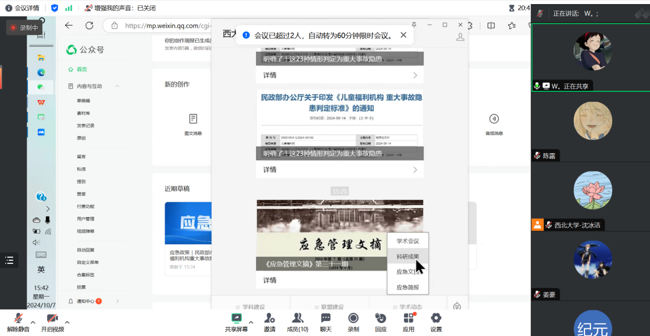 会议第二项,由运营副主任王英琴就《“西大应急”公众号编辑工作手册》进行讲解培训。王英琴以秀米平台为例,重点介绍了公众号图文编辑、文章推送、海报设计、封面设计的操作方式,并通过实例演示具体的操作方法。她详细地讲解了如何选择合适的模板,如何调整文字格式和图片布局,以及如何利用秀米平台的丰富资源来增强推文的视觉效果。在讲解的过程中,王英琴强调了应在编辑过程中保持内容的一致性和专业性,鼓励成员们在实践中不断探索和尝试,以提高自己的编辑技能。
