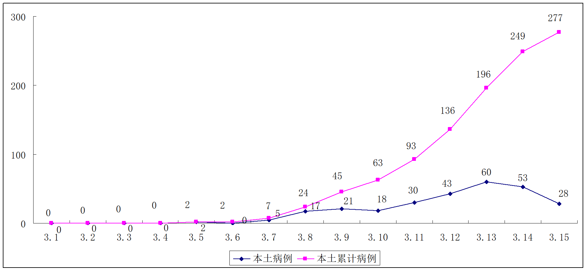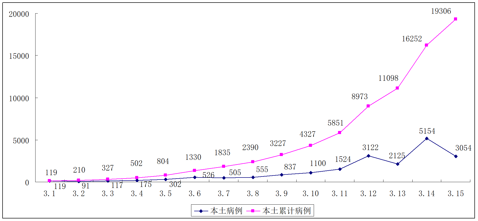 图1 3月1日---3月15日我国新增本土病例和累计病例情况