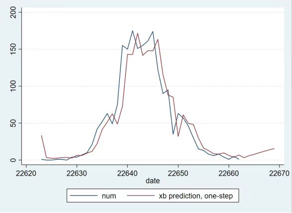 基于这些数据,经过多次比较发现,ar(1)与ma(3)的混合模型能够较好地拟合数据。这个混合模型的预测值与实际值的对比如图2所示。