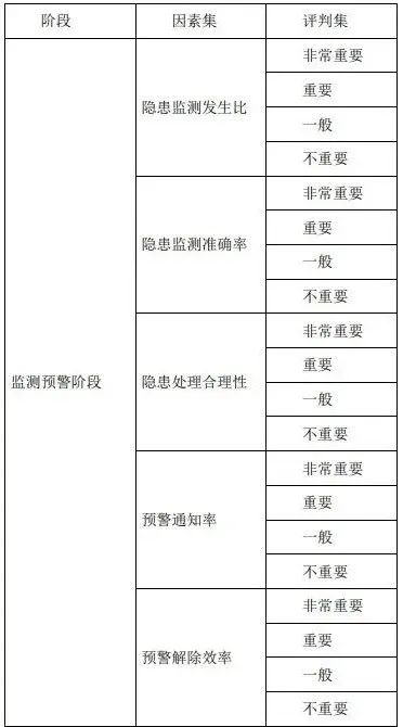 以监测预警阶段为例,针对模糊决策做一个探索应用。首先需要建立一个因素集:U{u1,u2……um},各元素U(i=I,2,……,m) 即代表各影响因素,假设这些因素分别为:U1——隐患监测发生比、U2——隐患监测准确率、U3——隐患处理合理性、U4——预警通知率、U5——预警发布效率、U6——预警解除效率;